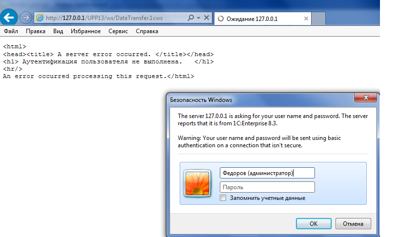Для выполнения ДЗ 7,8 объединил серверную часть (шаблон) с УПП 1.3. Все было нормально до определенного момента. Даже выполнил часть 7-го задания (обеспечение удаления объектов). Соединение выполнялось. Да и предыдущие ДЗ выполнялись в связке с УПП. Определенный момент — отключение света. Теперь никак не могу установить соединение с сервером, даже через браузер (см. скрин-шот). Почему-то не авторизует Федорова … (без пароля). Выскакивает окно авторизации. Уже пол-дня не могу решить проблему. Помогите, куда «копать»?