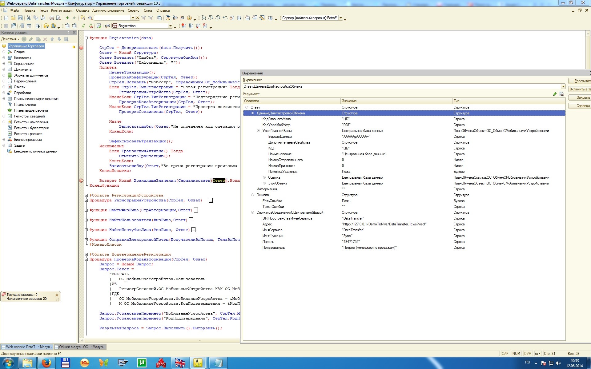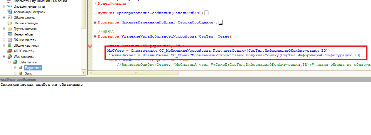 Поменял Федорова на Admin. Авторизация прошла. Но я получил странный результат. Оказывается, на стороне сервера синтаксический контроль не проходит. Там действительно есть синтаксические ошибки, а платформа их не видит…