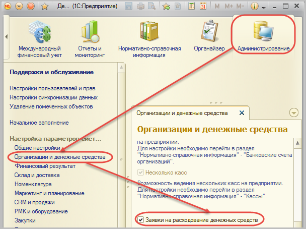 Документ Заявка на расходование денежных средств используется для согласования расхода денежных средств на предприятии. Использование документа в системе регулируется функциональной опцией Заявки на расходование денежных средств, данную функциональную опцию можно включить/отключить следующим образом: Администрирование – Организации и денежные средства – Заявки на расходование ДС.