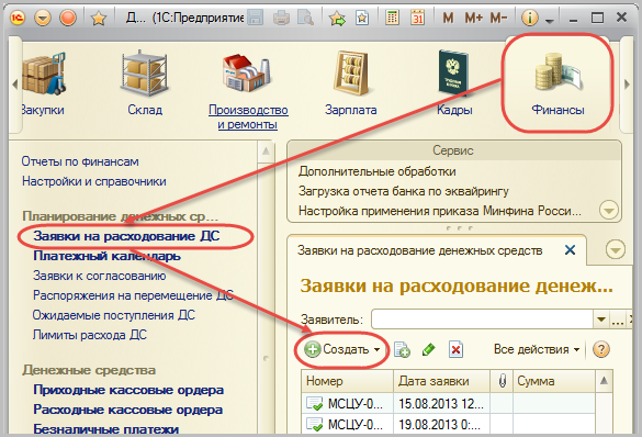Документ Заявка на расходование денежных средств можно открыть следующим образом: Финансы – Заявки на расходование ДС.