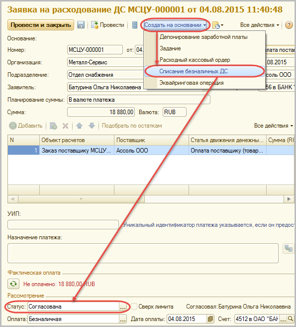 Таким образом, единственный статус Заявки на расходование денежных средств, позволяющий сформировать платежный документ на ее основании, – К оплате.