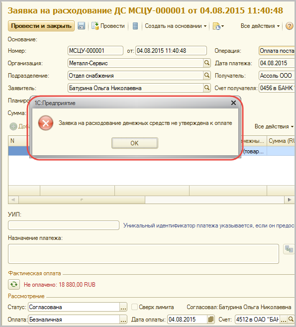 При попытке ввести платежные документы на основании Заявки на расходование денежных средств с другим статусом система выдает ошибку.
