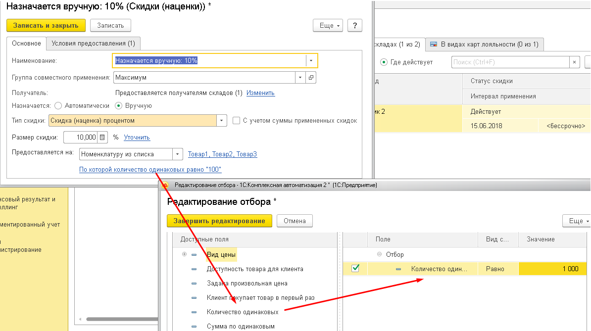Но при добавлении обоих товаров в заказ программа считает общее количество товаров в заказе и ставит скидку на оба если их общее кол-во больше 1000.Как настроить скидку ,что бы считалось кол-во товара в строке. Т.е. Если первый товар 1001 шт то на него скидка проставлялась ,а второй например 999 и на него скидка бы не действовала?