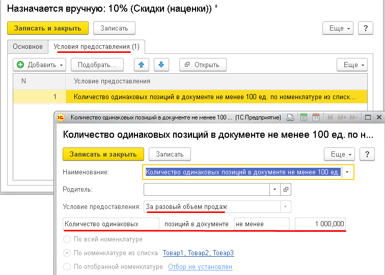 Затем, в документе реализации должны соблюдаться условия скидки для этого клиента (если условия скидки составные, т.е. состоят из нескольких условий, то должны соблюдаться все условия). В нашем примере это сумма покупки >>= 10000 руб. плюс покупка в воскресенье с 10 до 12 часов.